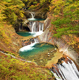 西沢渓谷は秩父多摩甲斐国立公園内に位置し、国内屈指の渓谷美を誇る景勝地です。「七ツ釜五段の滝」に代表される大小さまざまな美しい滝の織りなす渓谷美は圧巻で、初夏のシャクナゲや秋の紅葉も見事です。