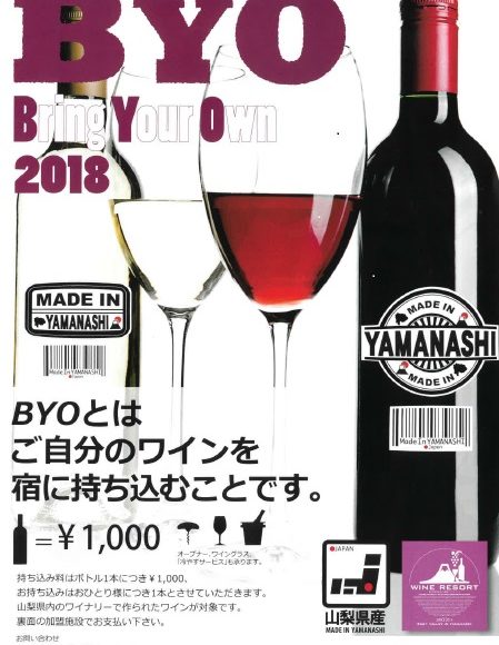 BYOとは “ Bring Your Own ”のそれぞれの頭文字をとった略語で、アメリカやオーストラリアなど海外の飲食店ではよく見られるお客様が自分で好きなお酒を持ち込んで食事を楽しむことができるシステムです。ワイナリーを巡って、お気に入りのワインを見つけたあとは、石和温泉の宿で、ワインをゆったりと堪能してはいかがですか。オープナー&ワイングラスのご用意や「冷やすサービス」なども承ります。(石和温泉旅館協同組合に加盟する33施設が対象です。)